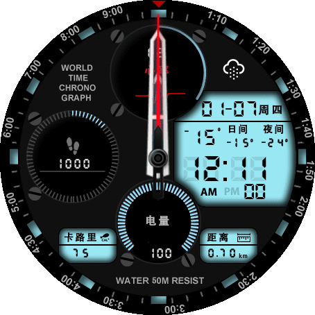 说明:液晶数字表盘包含:天气、温度、步数、距离、心率、卡路里、电量、信息。(12小时制需手机开启)