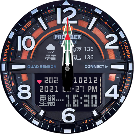 根据卡西欧prt-b50-4pr表盘更改,液晶显示面板做了扩大,指针中心变成透明,更容易看清楚表盘上面的信息,功能有天气组件,海拔,气压,心率,当前步数,步数完成度进度条,电池进度条,年月日,上午下午,中文星期,还有数字时间显示。心率图标修改为可动图标,20秒显示条也为可动图标。