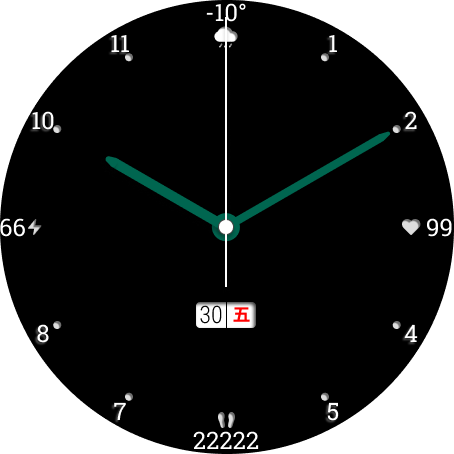 多功能,包含日期,星期,电量,心率,步数,天气。